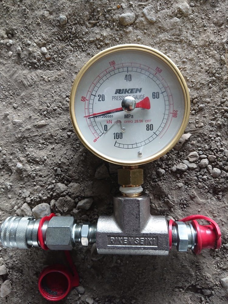 こちらは、あと施工アンカーを引張試験する時に使用する圧力計です。