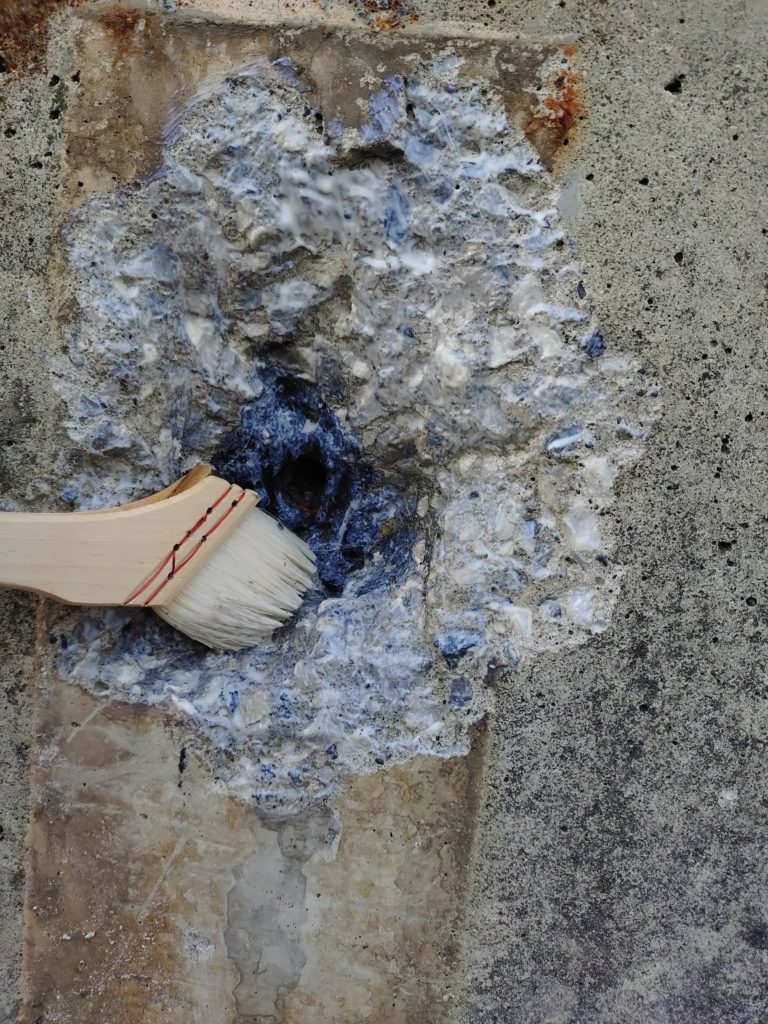 補修材がしっかり躯体(くたい)にくっつくようにプライマー(接着剤)を塗布していきます。