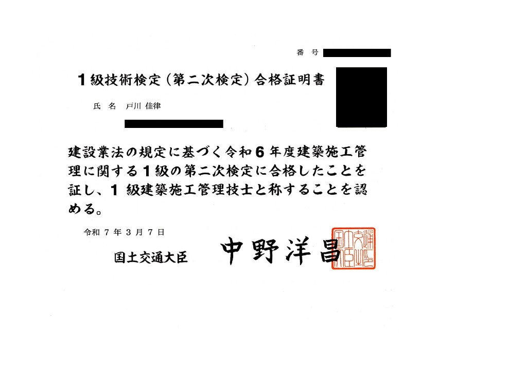 私事で恐縮ですが、1級建築施工管理技士にやっと合格することができました。