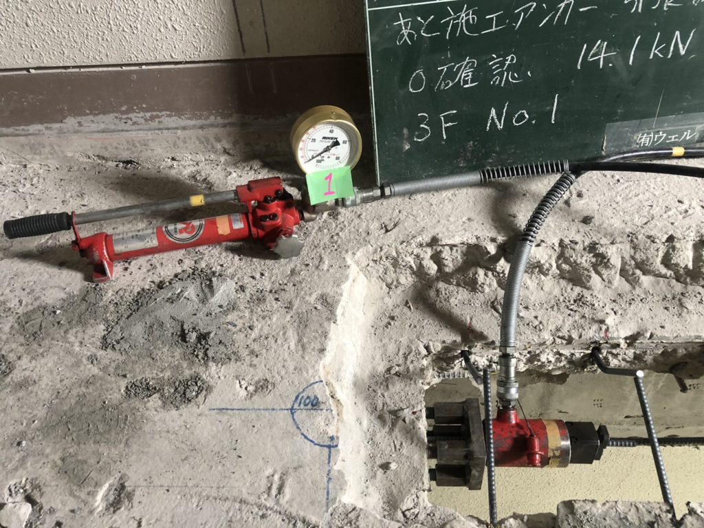 無作為に選びだしたアンカー筋を引張試験しました。結果合格です。合計3本試験しました。