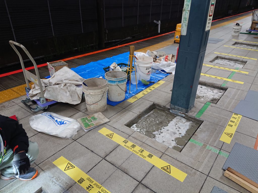 鉄道工事(夜間線閉)アンカー及びコアボーリング工事、グラウト流し込み