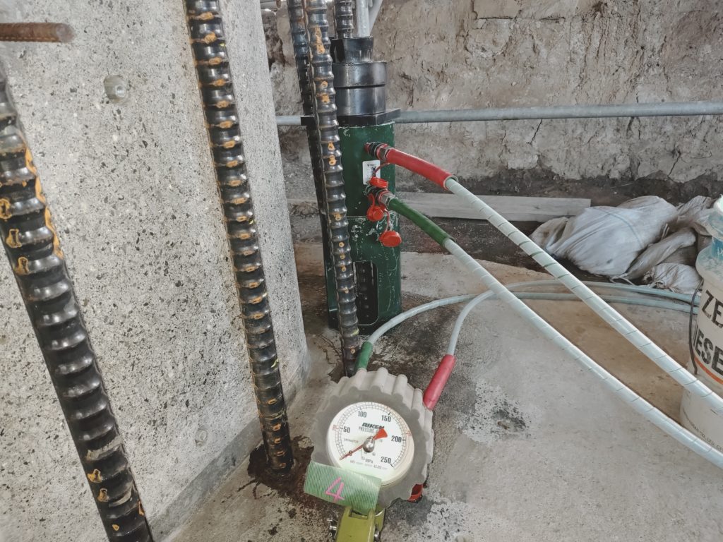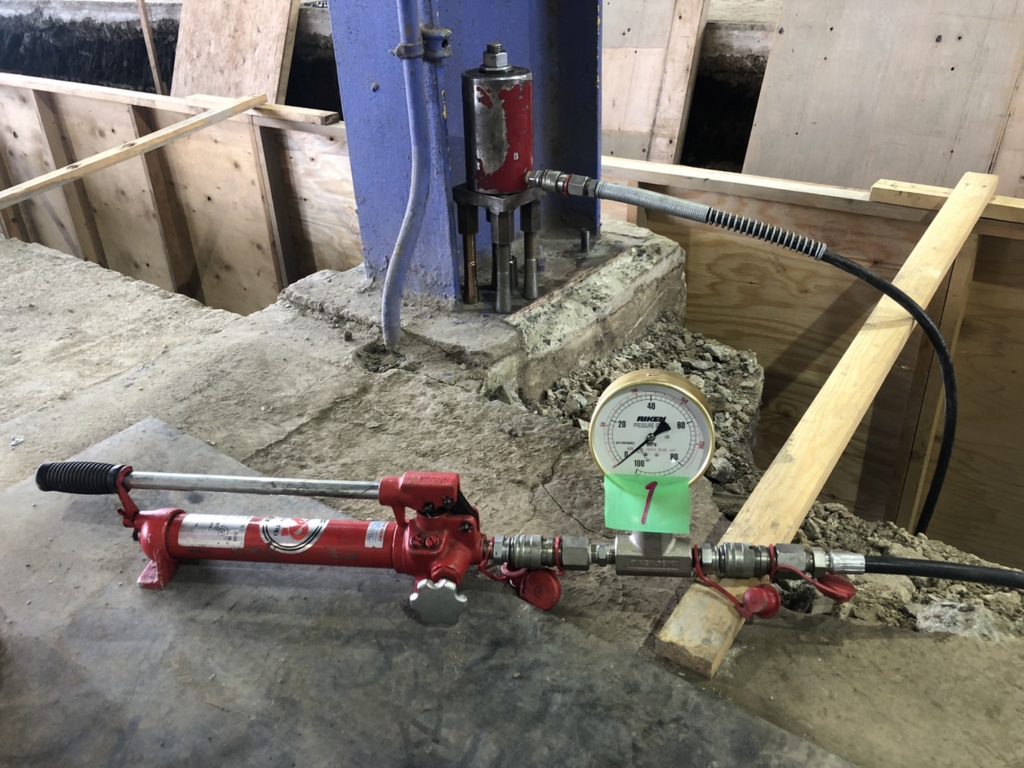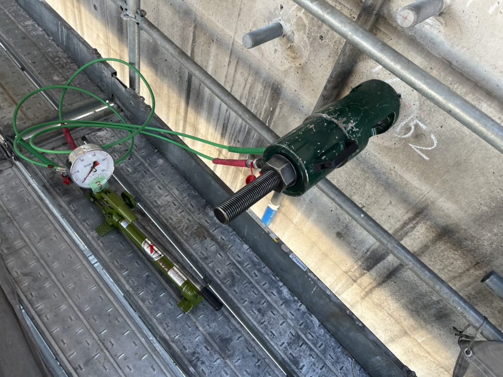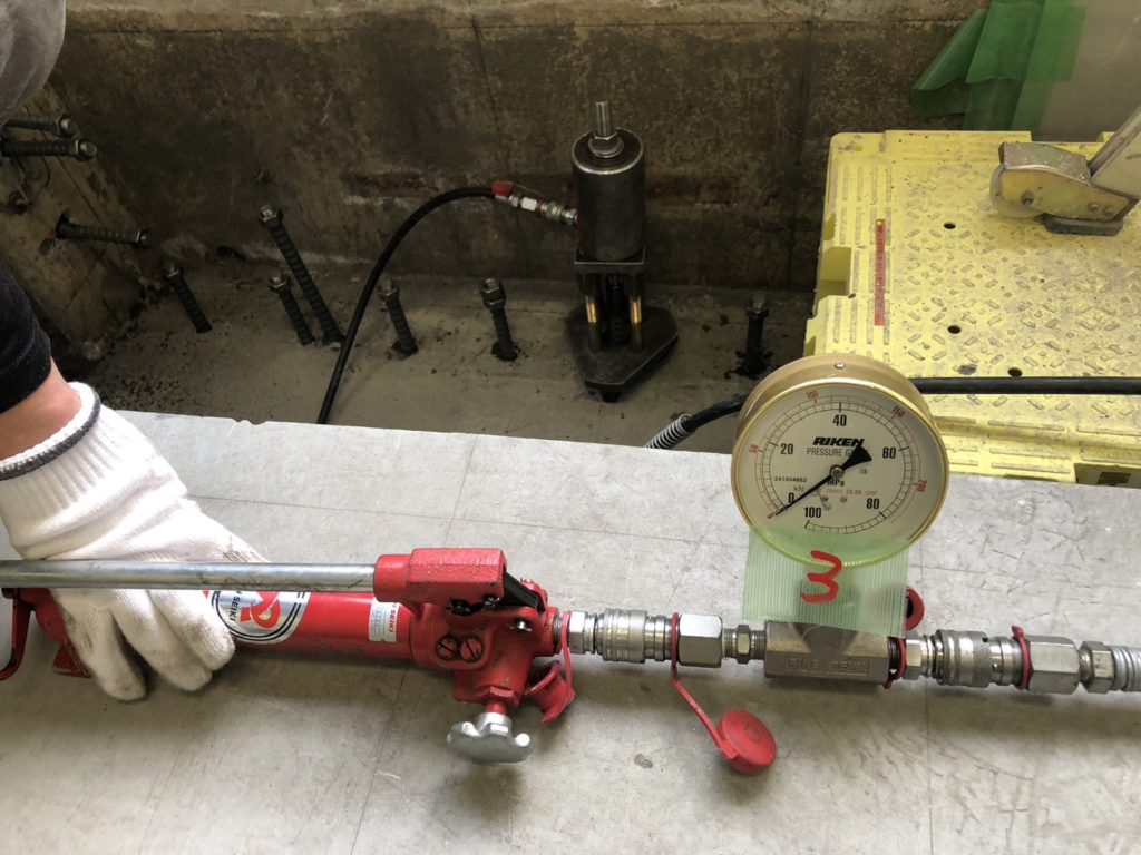 コンクリートに埋め込まれたアンカーボルトを引張試験機で引張り抜け出さないか確認するための品質
